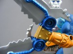 What really makes me crazy is that you can see all over Cy-Chop EXACTLY the parts reused and from what figure – for instance, the belt from Trapjaw, complete with the loops, which so importantly held the extra interchangeable pieces, but here just look like nonsense, complete with the screaming neon orange color. Why?! Sure, the orange and gold (a GOLD Horde logo?!?!) matches the technological crap on his forearms, but then why is his upper arms and lower half all Sasquatch, taken from Beast Man? It makes no sense and doesn’t look good – just odd. Fortunately, the eyes aren’t drawn to this nonsense, rather than to the over-sized scissor-weapons, which are preposterously huge. They’re stupid, but the GOOD stupid – exactly the stupid I expect from Masters of the Universe. They’re big and over-sized and impractical and I can ABSOLUTELY see them in the ’80s cartoons, either alongside Skeletor or fighting with the Horde against She-Ra. Despite their size, they don’t make him top-heavy, and they can be used for a few neat (albeit COMPLETELY IMPRACTICAL) poses. These are the one thing I think makes complete sense for this figure, and nearly sell me on liking the thing. Like Trap Jaw’s interchangeable attachments these can be removed and any of Trap Jaw’s/Horde Prime‘s/Roboto‘s etc bits can go on him instead, though I don’t see why you’d want to do this aside from brief curiosity.